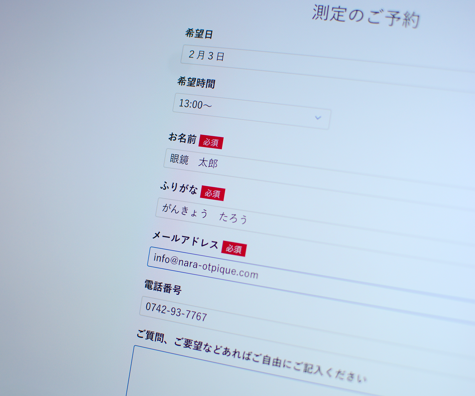 ②ご希望される測定の日時やお名前、メールアドレスをご入力ください